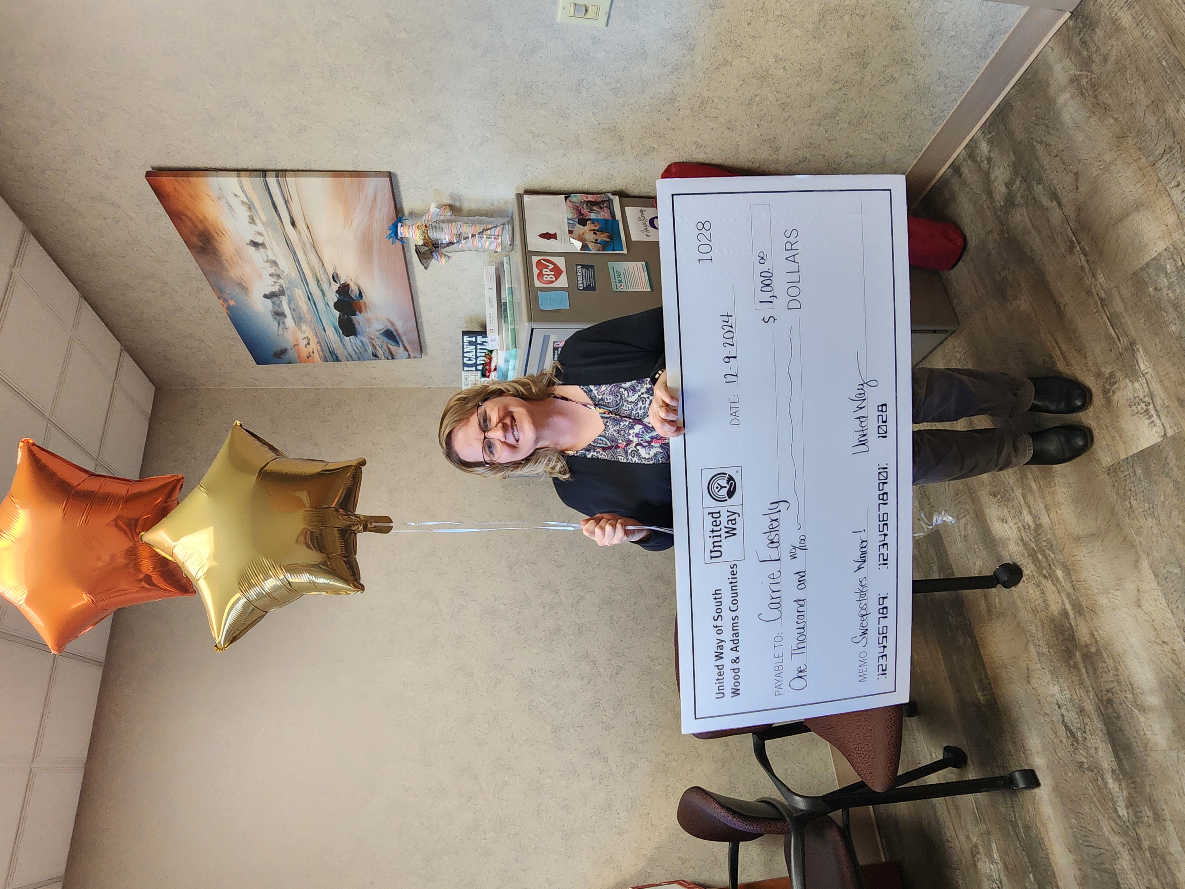 Carrie Easterly of Emplify Health by Gundersen is presented with a $1,000 check in 2024.