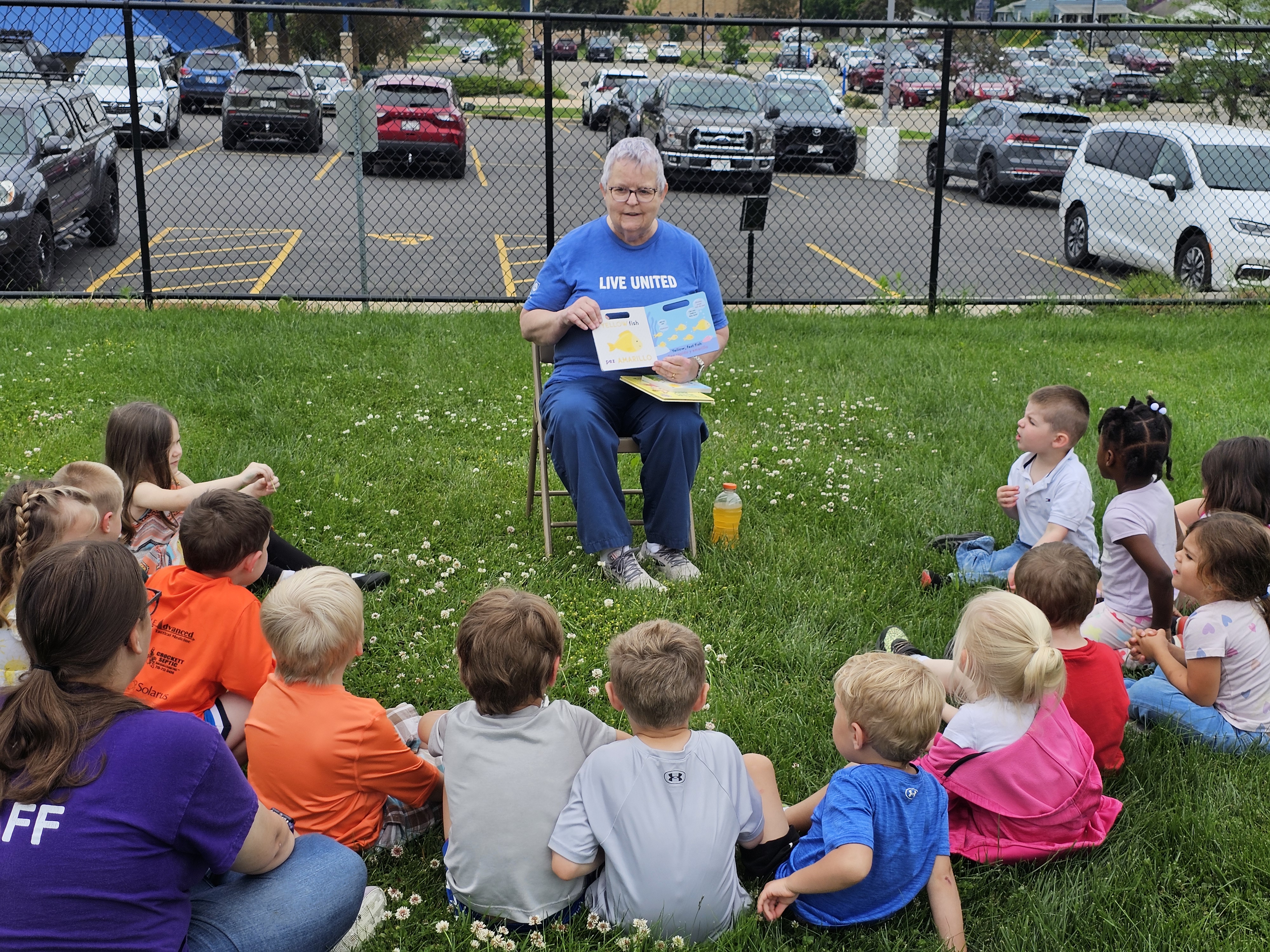 Children listen while a volunteer reads them a book during the 2025 Great Book Giveaway.